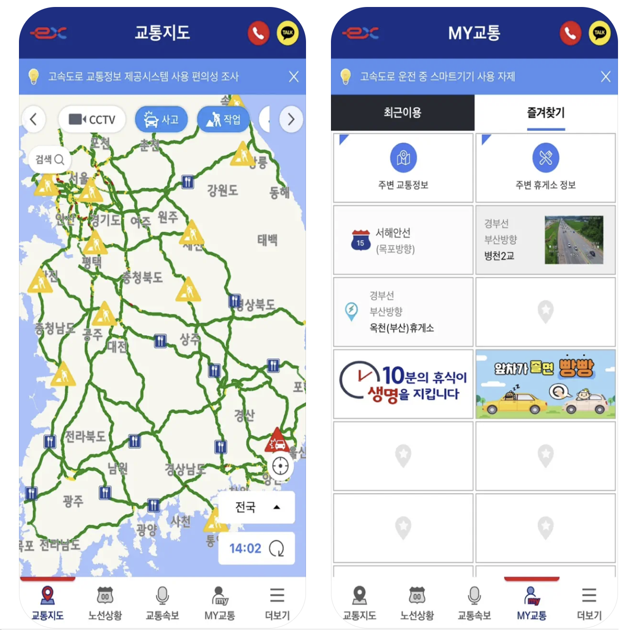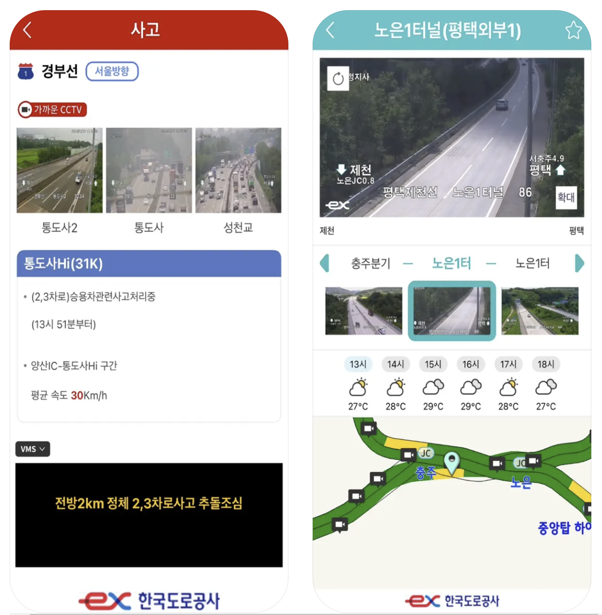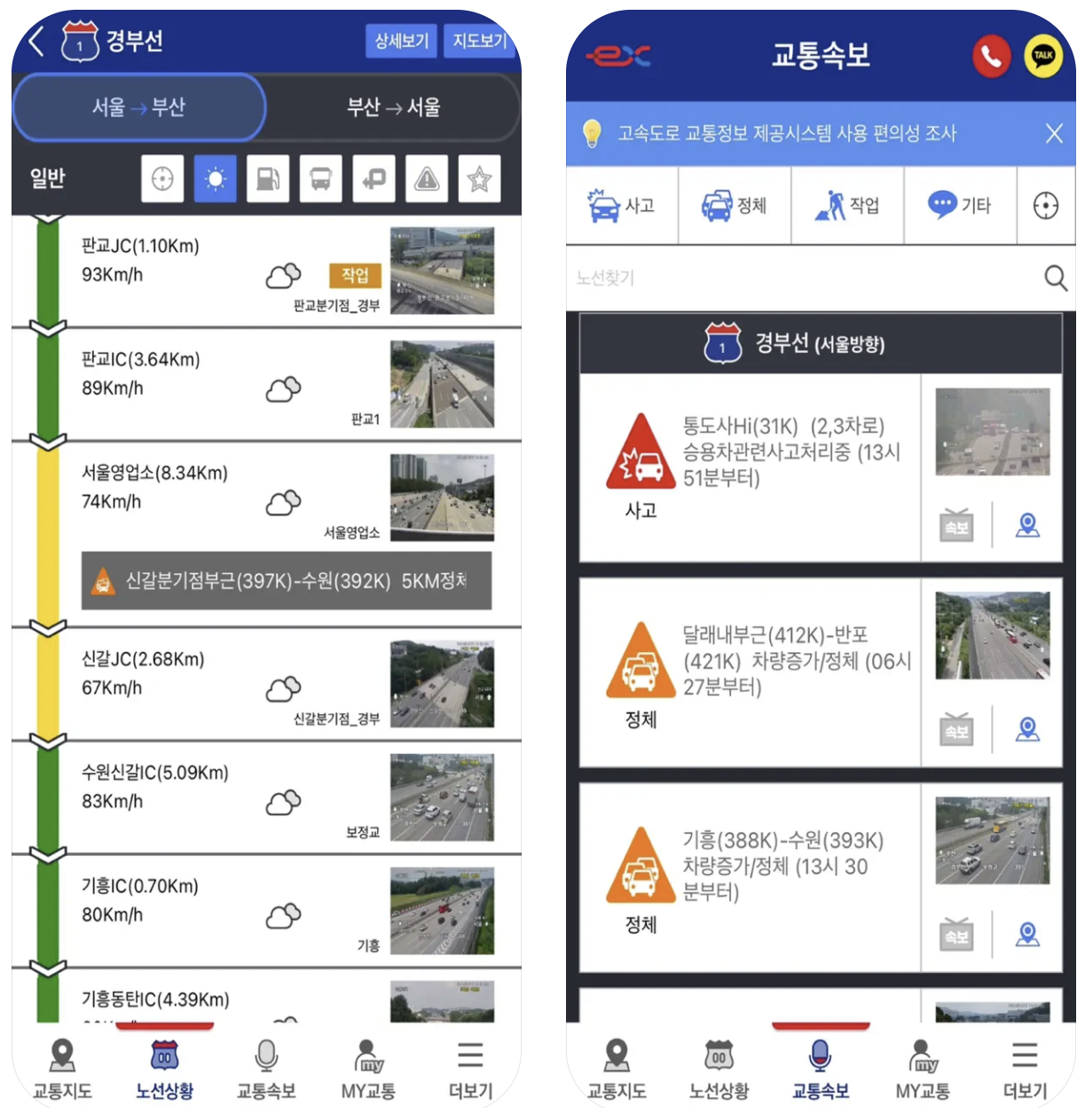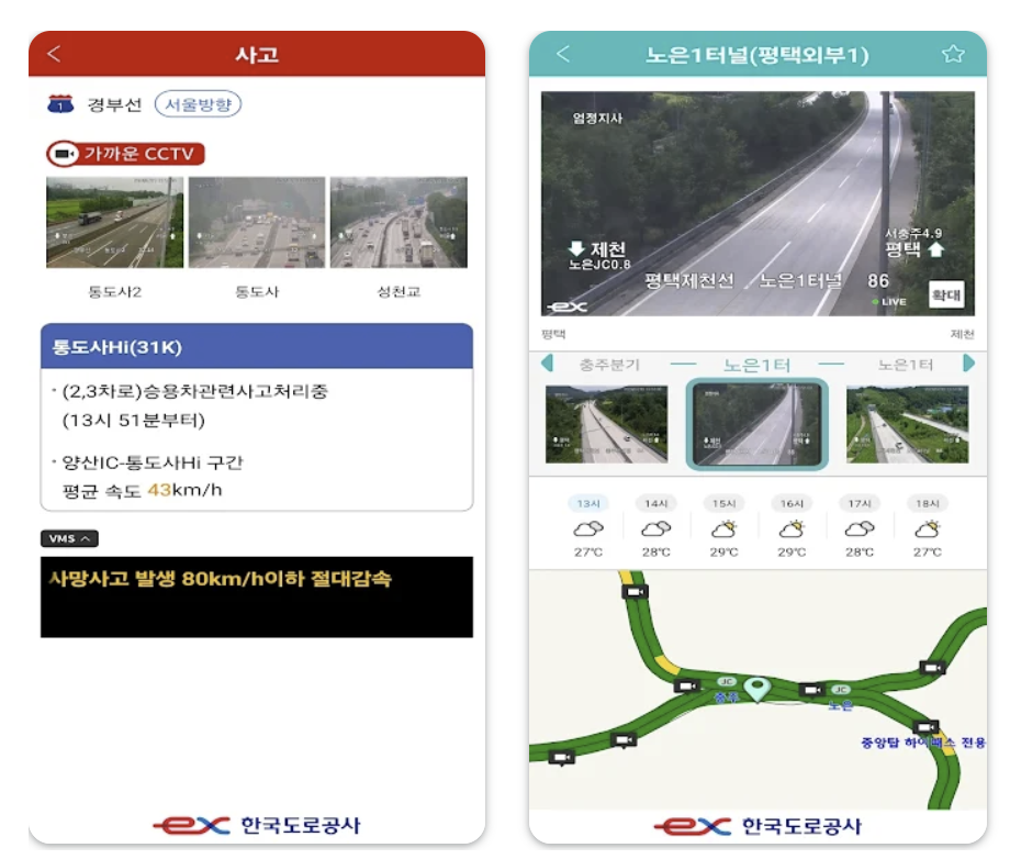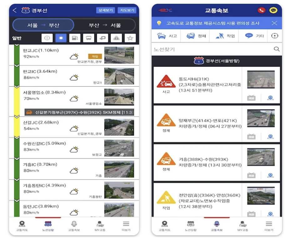 고속도로의 실시간 교통정보와 CCTV 영상을 제공하는 앱입니다. 교통 상황, 사고 정보, 정체 구간 등을 쉽게 확인할 수 있습니다.