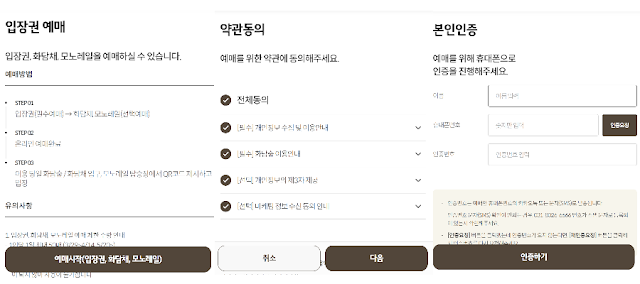 - 본인인증 후 예매가 진행되며 모바일인증(카카오, 네이버, pass 등)을 미리 준비하셔야 합니다.