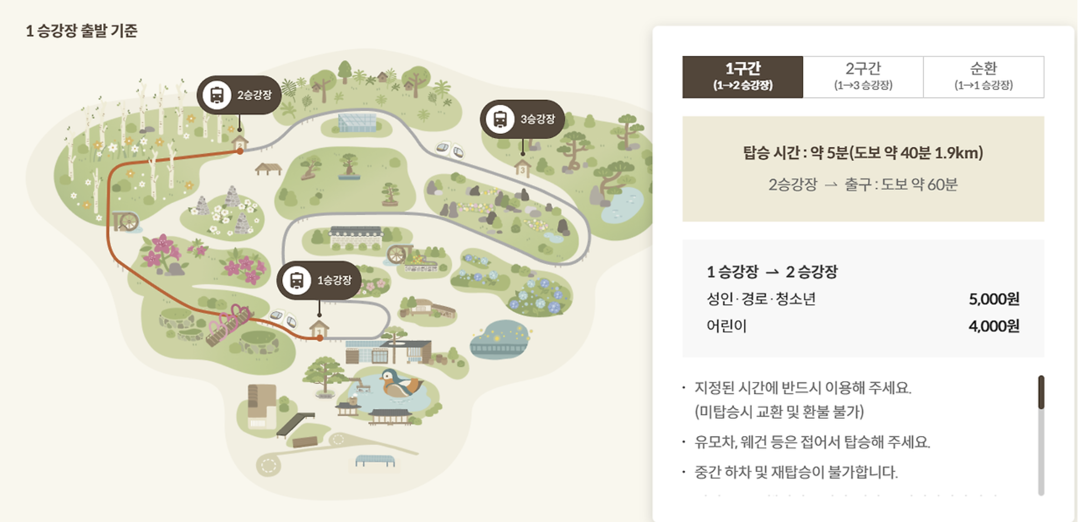 - 1구간: 1승강장 → 2승강장/ 성인 5,000원 , 어린이 4,000원