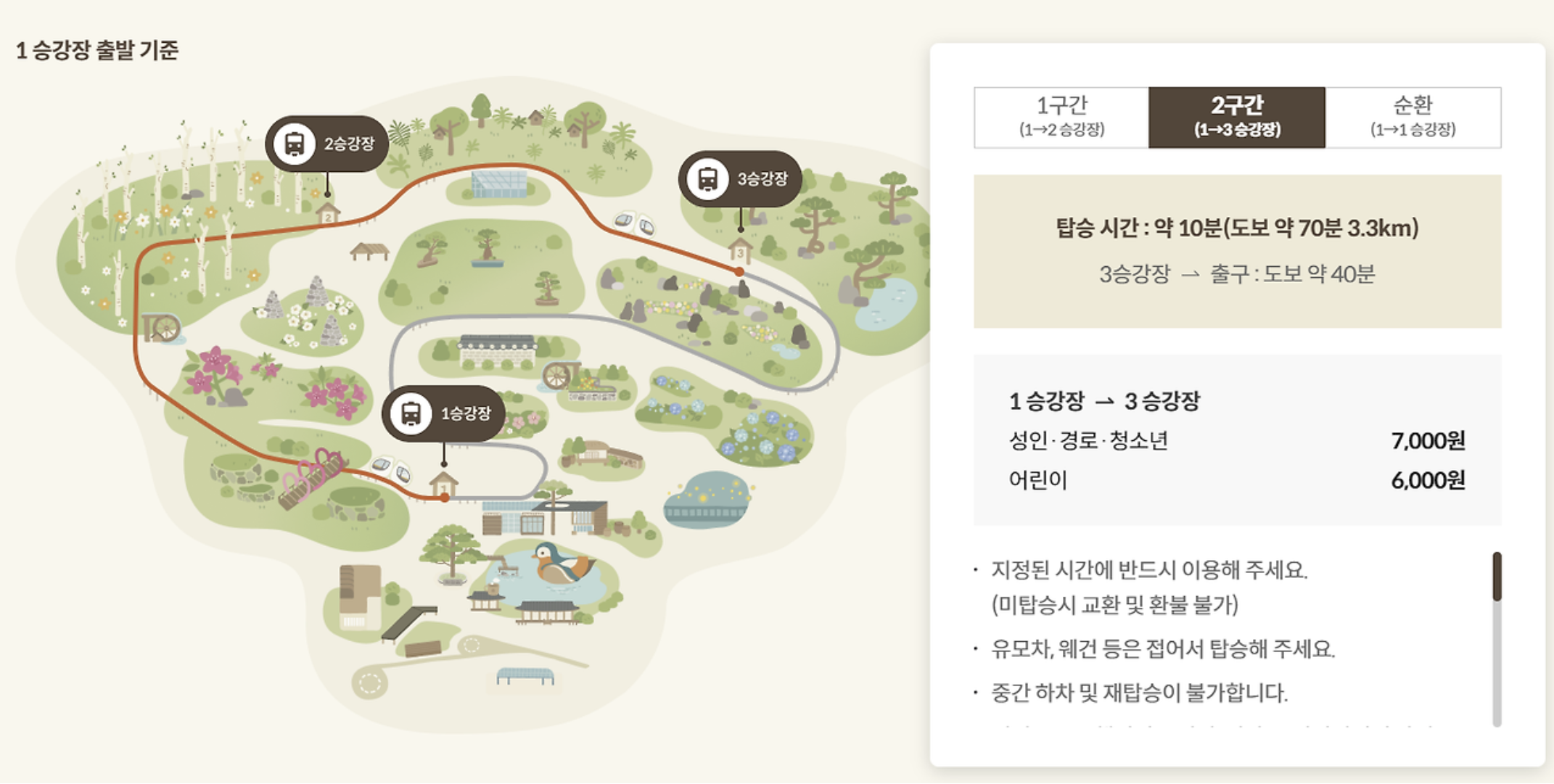 - 일반적으로 많이 이용하는 코스: 1구간 모노레일 탑승 >2승 강장 하차 > 전망대 > 도보로 내려오기 2승강장 >1승강장> 입구> 주막