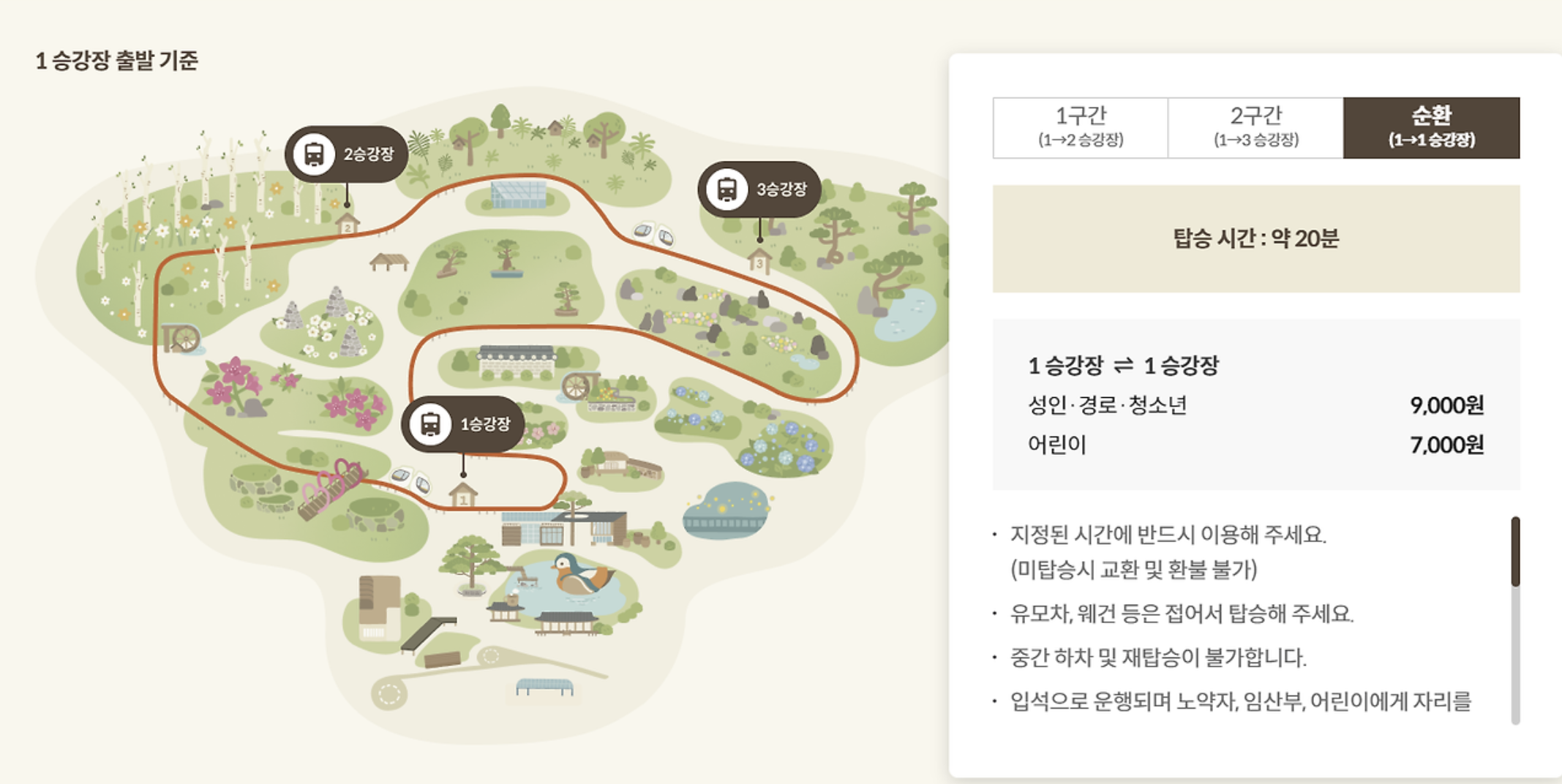 - 순환구간: 1승강장→ 1승강장 / 성인 9,000원, 어린이 7,000원
